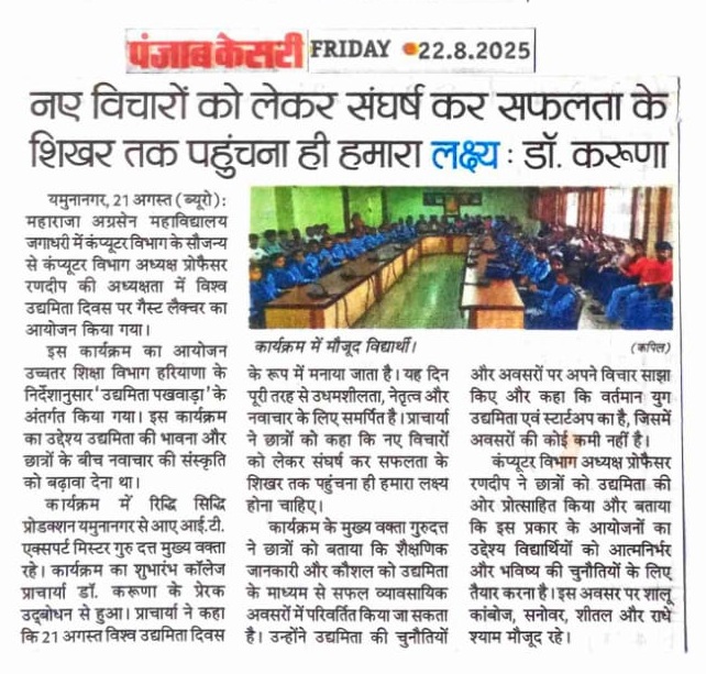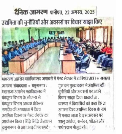 A GUEST LECTURE WAS ORGANIZED BY DEPARTMENT OF COMPUTER SCIENCE AND APPLICATION ON TOPIC “ENTREPRENEURSHIP AWARENESS AND SELF EMPLOYMENT” UNDER THE THEME “ENTREPRENEURSHIP PAKHWADA” ON 21-08-2025.