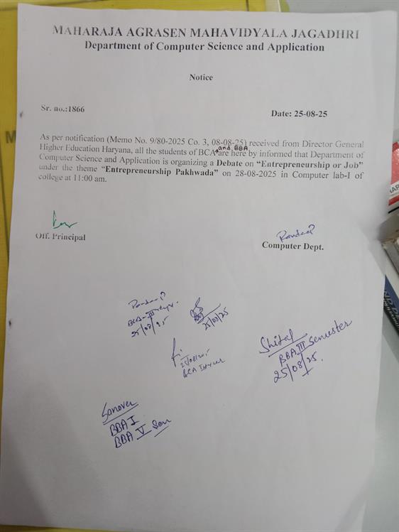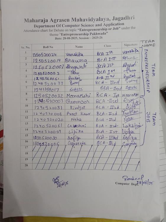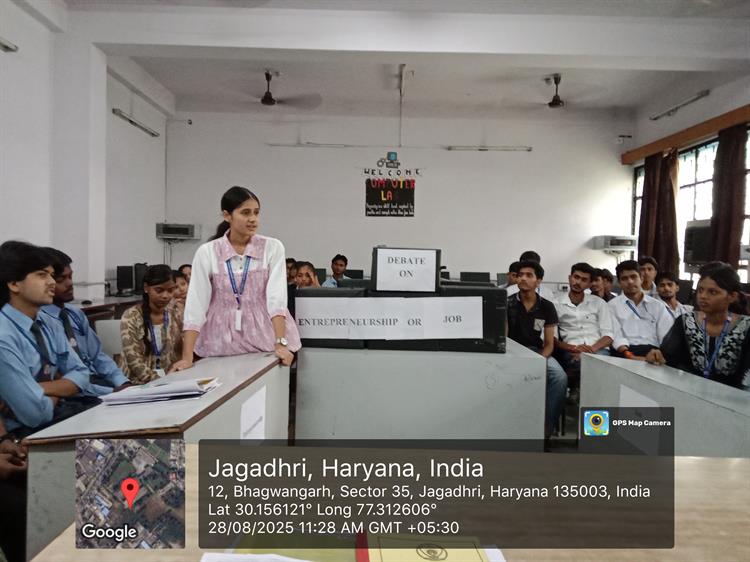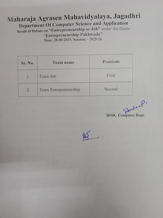 A DEBATE WAS ORGANIZED BY DEPARTMENT OF COMPUTER SCIENCE AND APPLICATION ON TOPIC “ENTREPRENEURSHIP OR JOB” UNDER THE THEME “ENTREPRENEURSHIP PAKHWADA” ON 28-08-2025.