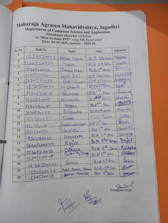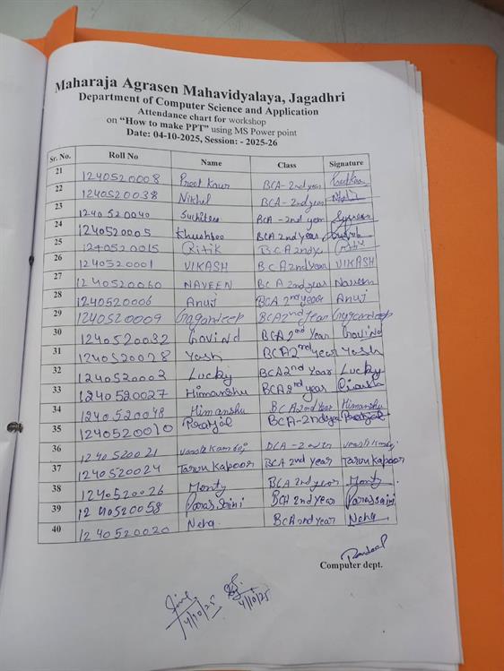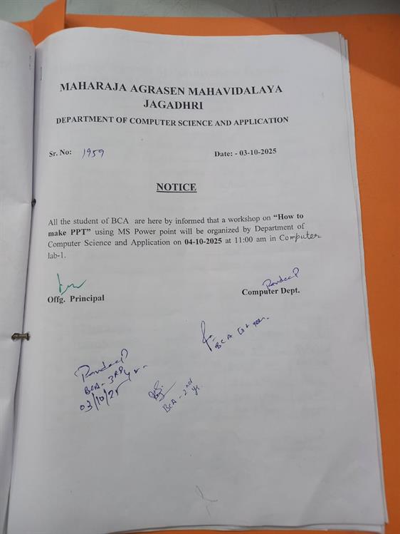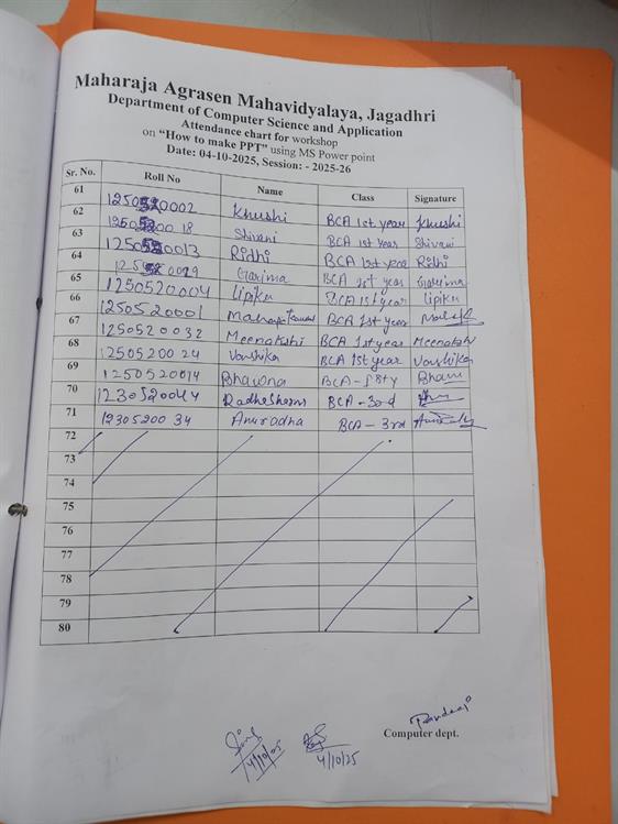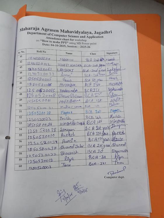 A WORKSHOP ON HOW TO MAKE PPT WAS ORGANIZED BY DEPARTMENT OF COMPUTER SCIENCE AND APPLICATION ON 04-10-2025 IN COMPUTER LAB AT 11:00 AM. FOR BCA STUDENTS.